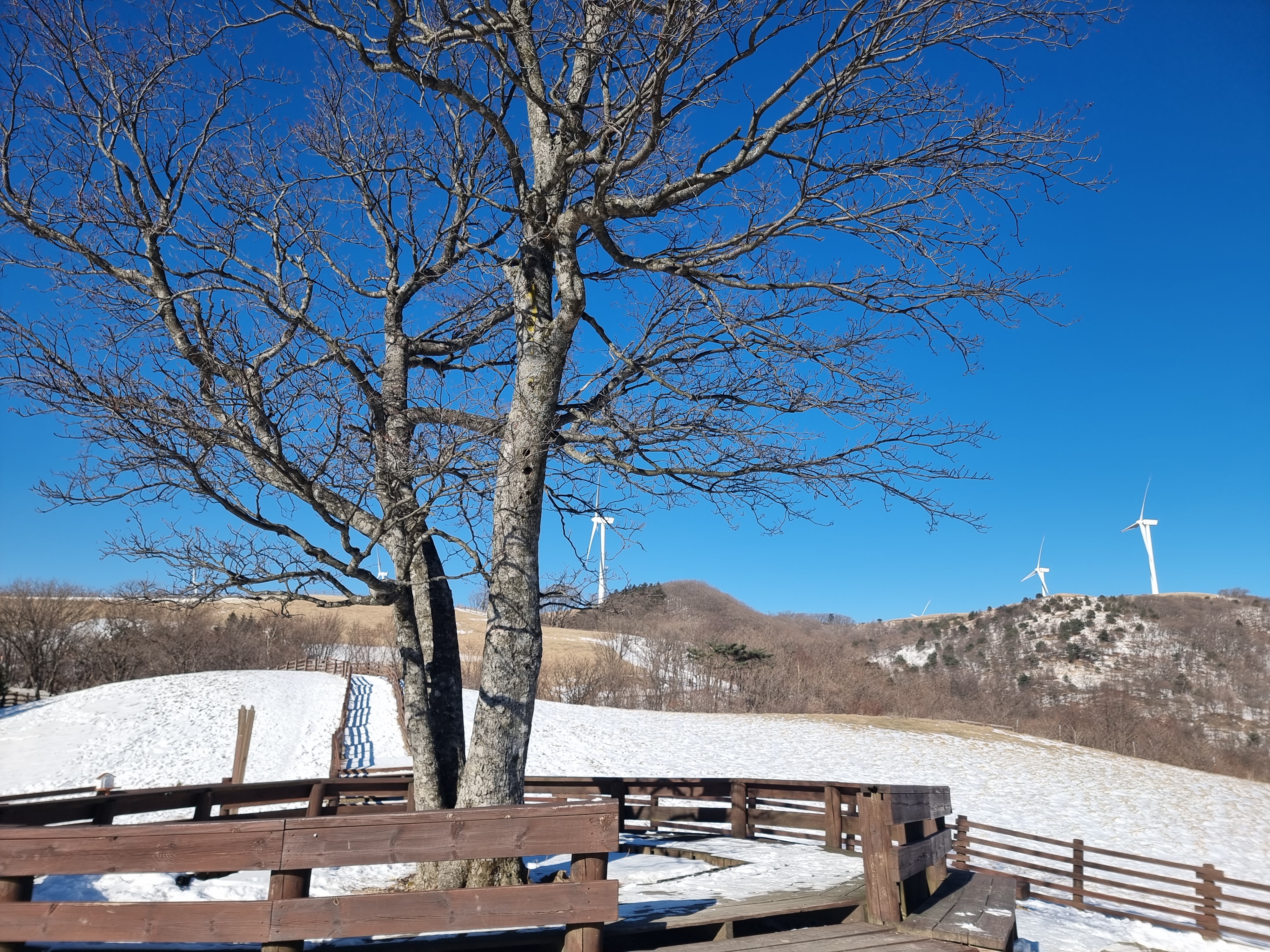 겨울이라 추워서 밖에 나와 있는 동물들은 없지만 넓은 목장과 풍력발전기만으로도 멋진 풍경을 자랑합니다. 그리고 반대편으로는 멀리 동해바다를 볼 수 있습니다. 전망대에서 내려가는 길에는 영화 '연애 소설'에 나온 나무도 볼 수 있습니다. 겨울이라 잎은 다 떨어져 약간 쓸쓸 해 보입니다.
