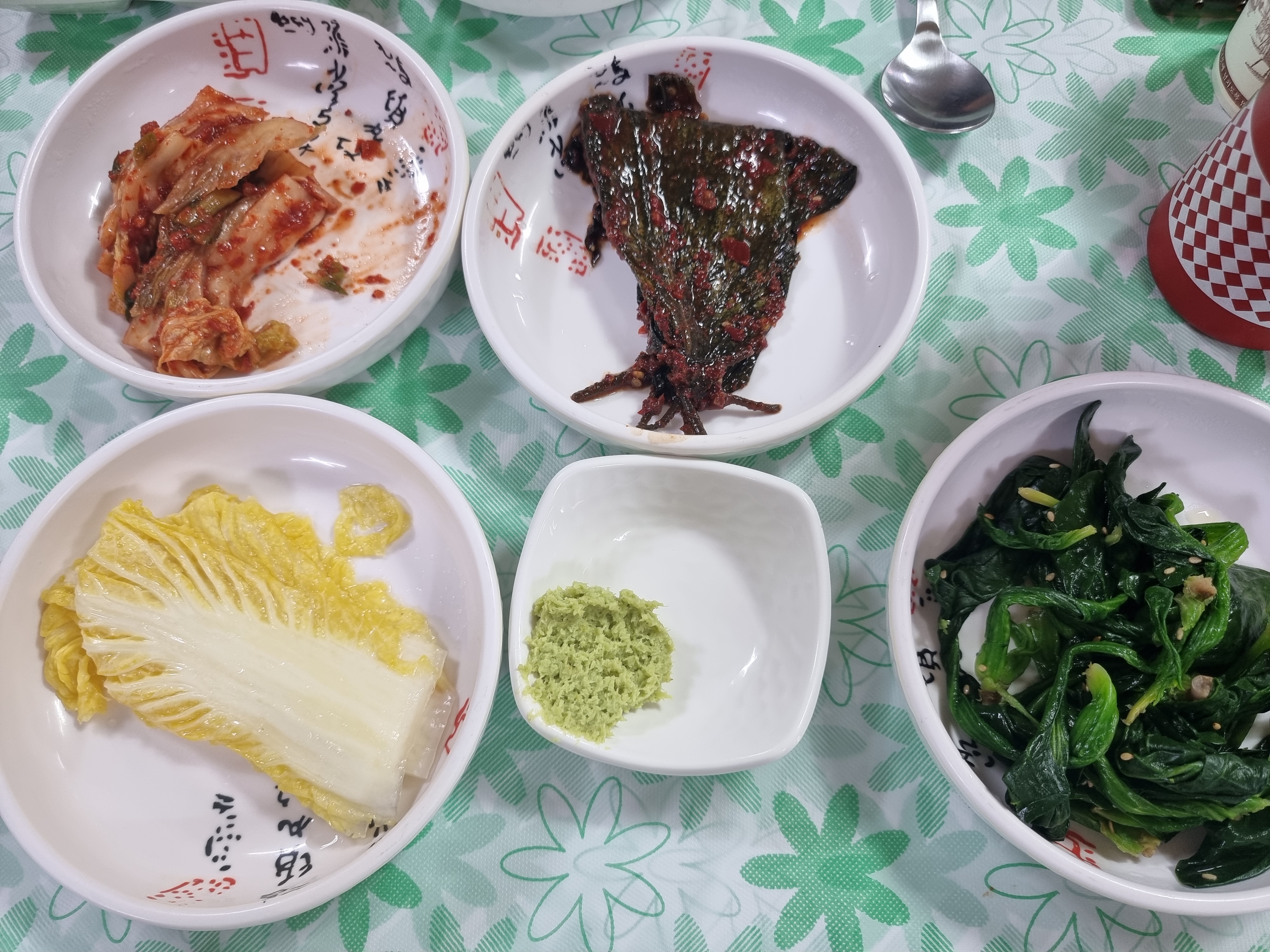 반찬은 직접 조리한다고 안내되어 있었어요. 백김치, 김치, 깻잎무침 등 군더더기 없는 반찬들이 같이 나옵니다. 그리고 센스있게 반찬이 떨어질 때 즈음 다시 채워주시더라구요. 마지막에 쭈꾸미와 야채들로 시원하게 우러난 육수에 칼국수로 마무리하면 완벽한 한끼 식사가 됩니다.