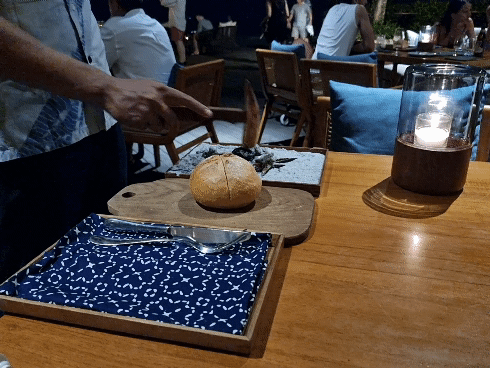 씨솔트(Seasalt) 레스토랑 야경과 제가 시켰던 디너 메뉴들입니다. 저는 사이드 디쉬로 나시고랭과 메인 디쉬로 문어(메뉴명 : Confit Fried Octopus)와 치킨 요리(메뉴명 : Rosemary Garlic Roasted Chicken)를 주문하였어요. 메뉴가 나오기 전에 직원분이 오셔서 식전 빵에 찍어먹을 버터를 쪼개(?)주십니다. 인도네시아, 발리 맥주인 빈땅과 함께 같이 먹으니 메뉴도 그렇고 분위기도 그렇고 모두 꿀맛이었습니다. 꼭 알릴라 스미냑에 묵고있지 않아도 레스토랑에 방문해서 저녁 식사 자리를 해도 좋을 것 같아요.