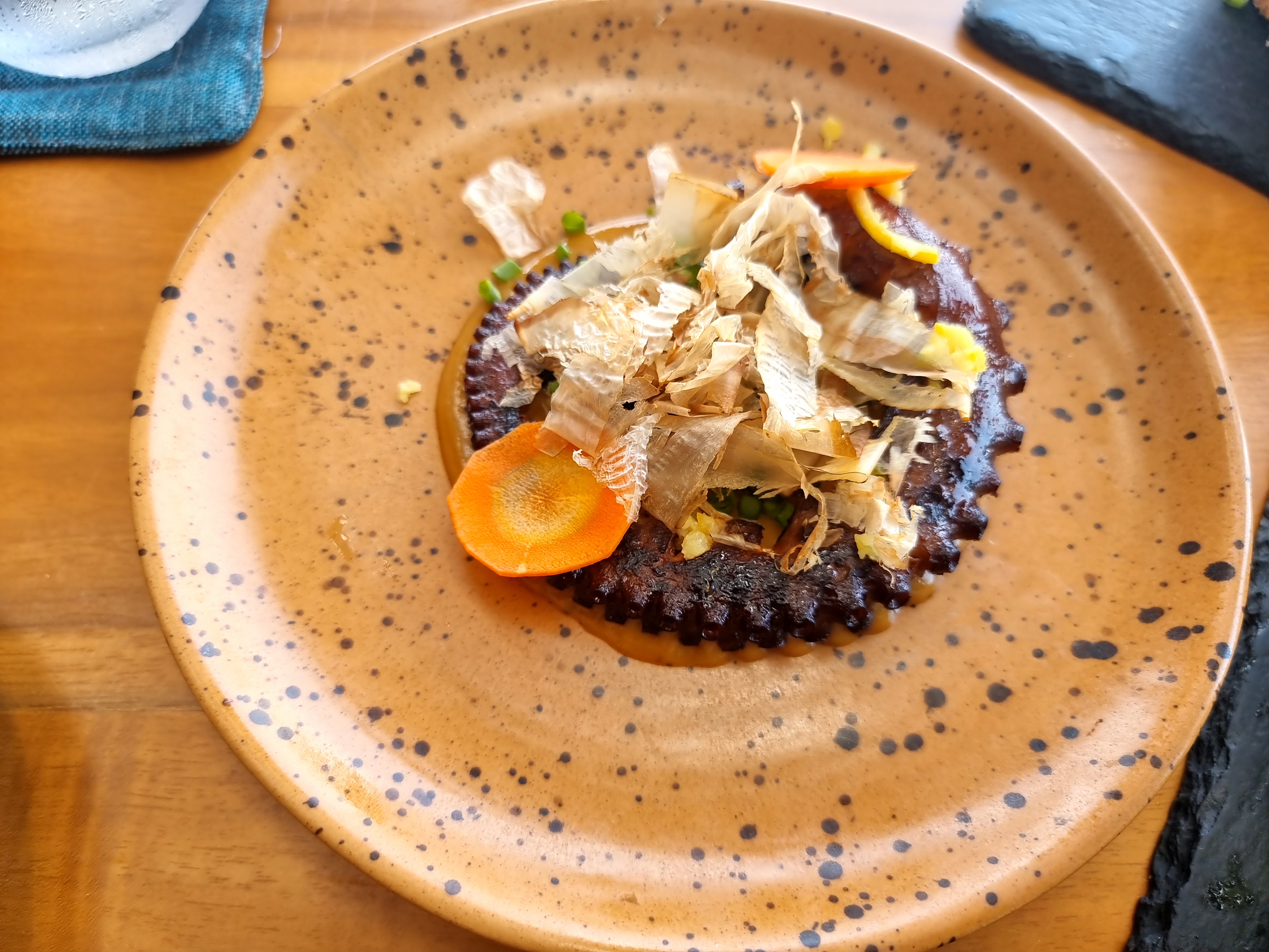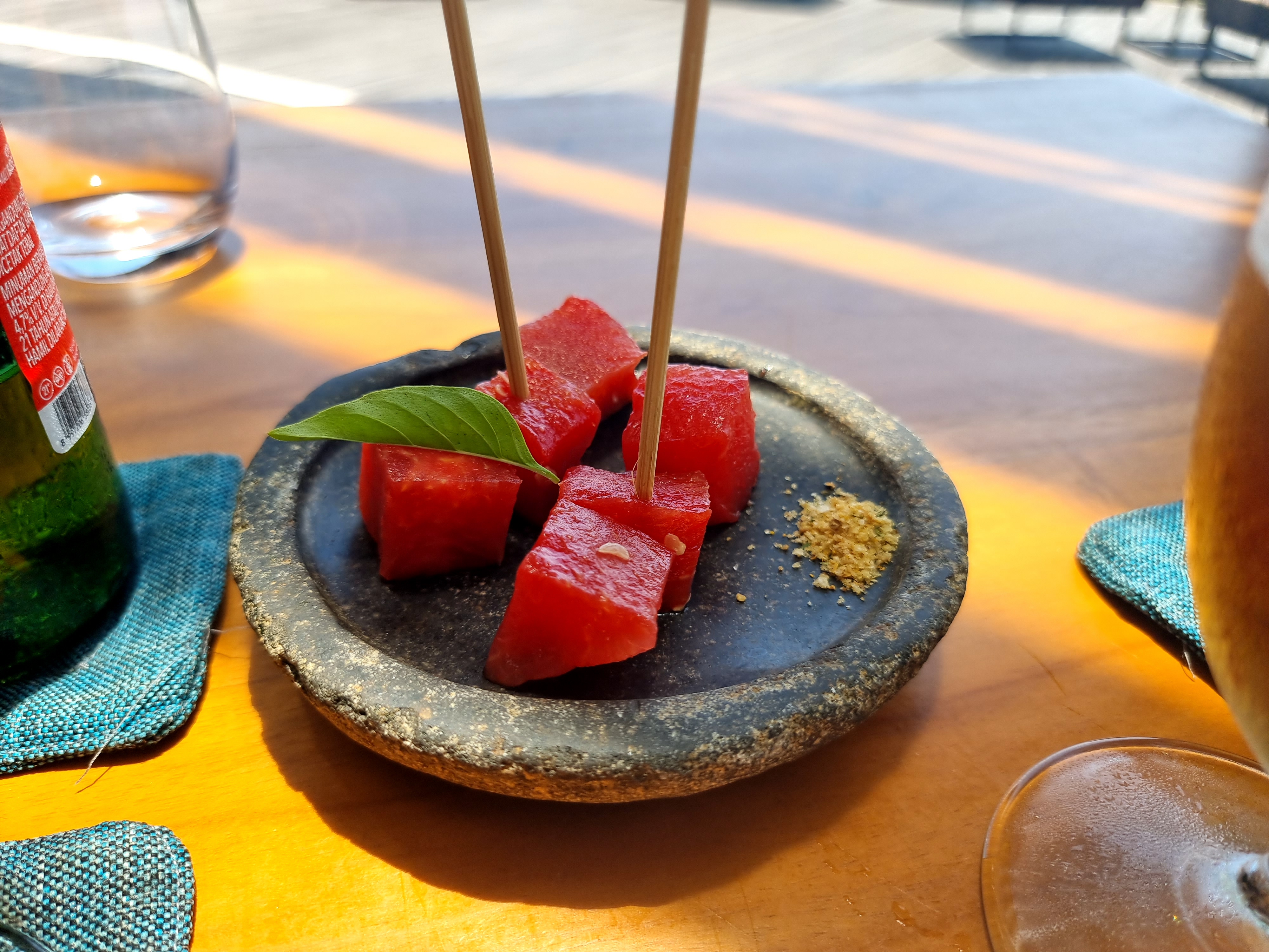 애피타이저와 메인, 디저트 메뉴를 각각 1개씩 고를 수 있어요. 소금에 찍어먹을 수 있는 수박과 빵이 식전 음식으로 나왔습니다. 그리고 저는 애피타이저로는 마키롤, 샐러드, 메인으로는 옥토포스와 씨푸트 산도, 디저트로는 초콜릿과 패션코코를 주문하였습니다. 애피타이저는 모두 맛있었고, 전날 디너로 먹는 옥토포스(문어) 요리도 역시나 맛있었어요. 씨푸트 산도는 빵 사이에 어묵을 끼워넣은 느낌이었는데 그저 그랬습니다. 디저트로 시켰던 메뉴들도 예쁘기도하고 맛도 좋았습니다.