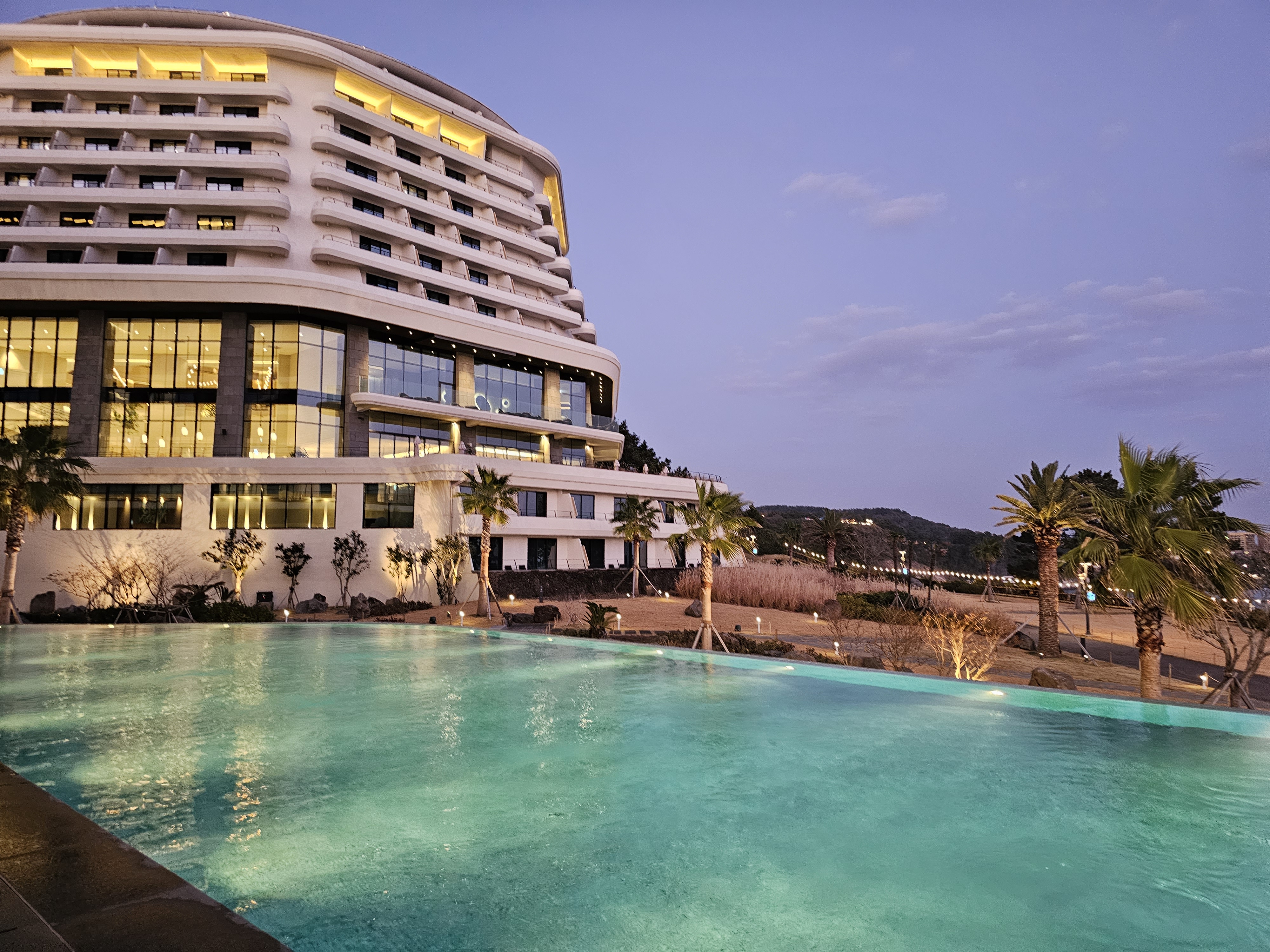 파르나스 호텔 제주는 110m의 커다란 수영장을 가지고 있는 것으로 유명합니다. 상시 온수풀로 운영하고 있어 겨울에도 따뜻하게 이용 가능하고, 넓은 바다를 바라보며 수영을 즐길 수 있어요. 겨울이라 사람이 많이 없어서 그런 건지, 넓어서 그런 건지 사람이 많지 않아 여유롭고 쾌적하게 이용할 수 있습니다. 밝은 낮 시간에 이용해도 좋고, 저녁에 지는 노을을 바라보며 이용하는 것도 너무 좋았어요.