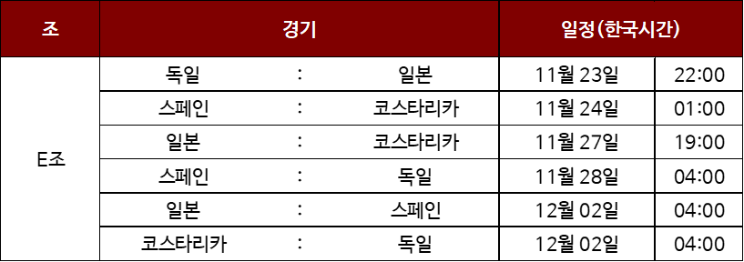 E조 : 스페인(7위), 코스타리카(31위), 독일(11위), 일본(24위)