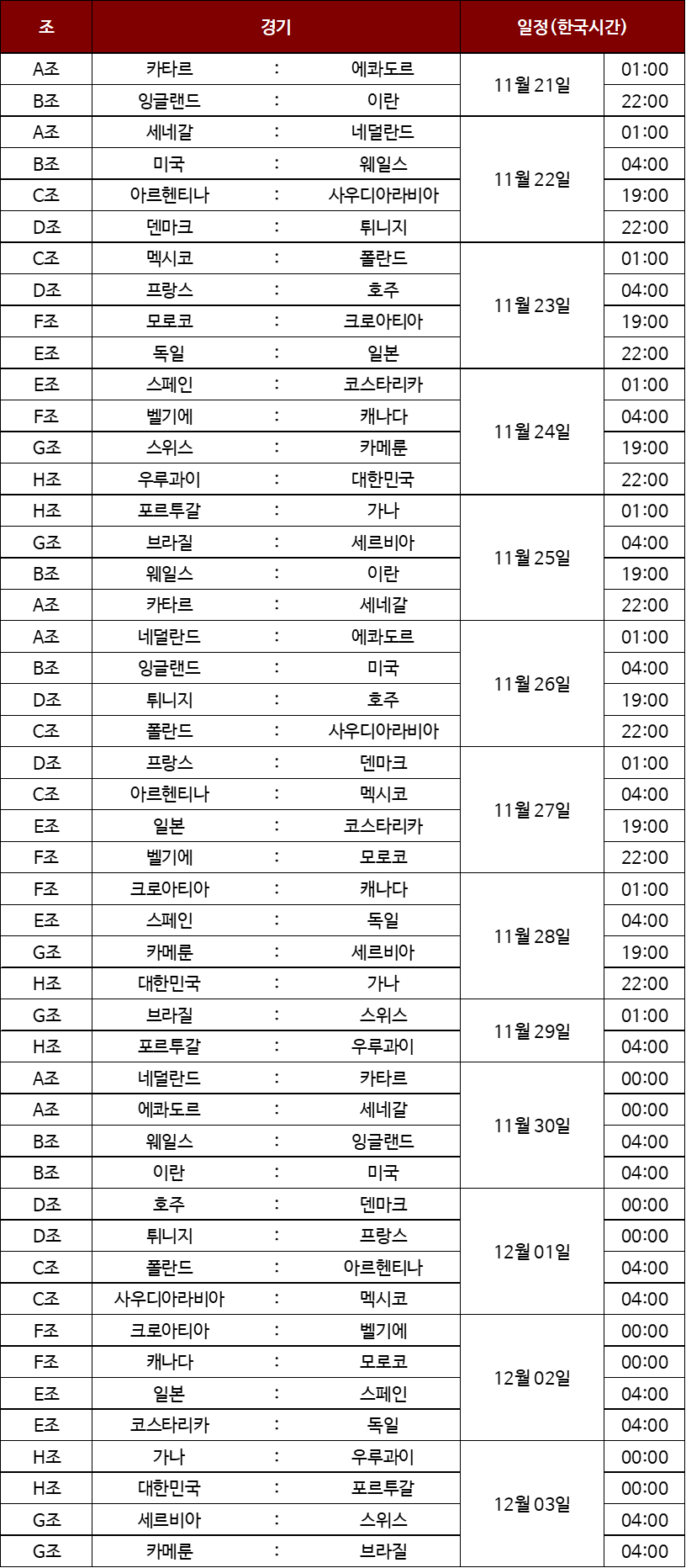 조별 경기일정과 날짜순 경기일정입니다. (한국 시간 기준)