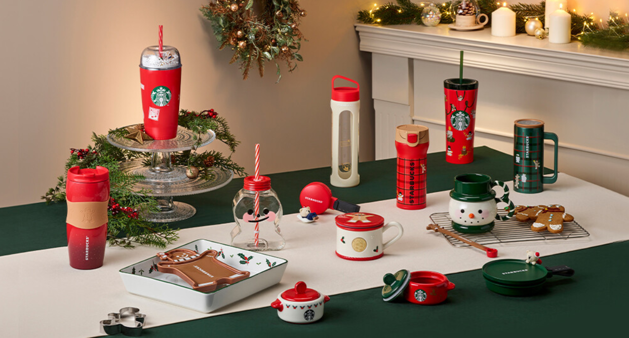 스타벅스 매장에 진열되어 있는 크리스마스 MD 상품들 실물 사진입니다.